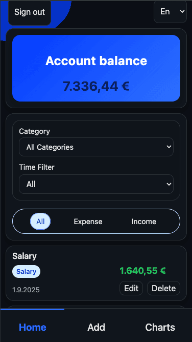 A personal finance app for tracking transactions, categories, and monthly spending with a clean, focused interface.